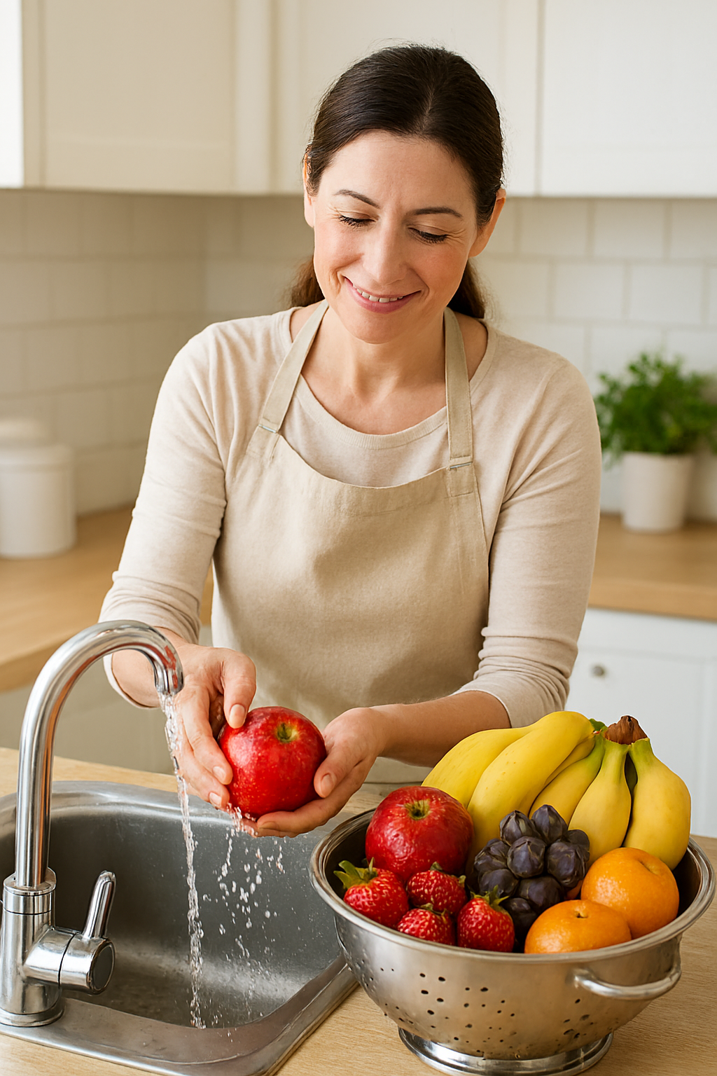 과일은 생산→운송→진열 과정에서 표면에 잔류 농약, 먼지, 세균이 붙기 쉽습니다. 특히 표면이 울퉁불퉁하거나 껍질에 주름이 있는 과일일수록 오염물이 더 쉽게 숨어요. 그래서 먹기 전 반드시 올바르게 씻는 것이 중요합니다.