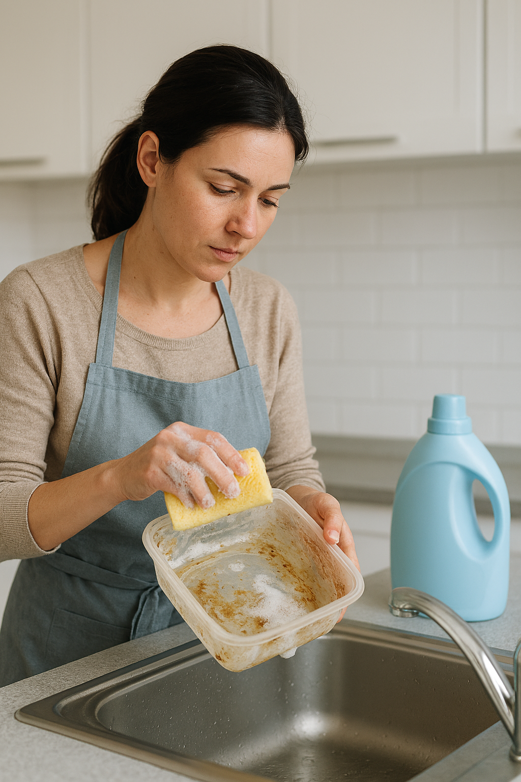 기름 성분은 굳기 전에 중성세제로 먼저 헹굽니다. 주방세제 1스푼 + 뜨거운 물로 빠르게 세척하세요.